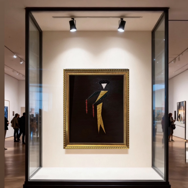 Su cuerpo, afilado en oro, tallado por la misma luz que baña la arena al atardecer, transmite sensación de movimiento y elegancia contenida, el instante previo en que el valor se vuelve forma en el inicio de la faena. Predomina un tono dorado o amarillo mostaza en el torso y las piernas, cuya textura aporta relieve y remite simbólicamente al traje de luces, reforzado por la montera que corona la cabeza Las banderillas, representadas de manera abstracta utilizando un rojo intenso como sangre hecha simbolo, como la memoria del toro que aún no ha entrado en escena.